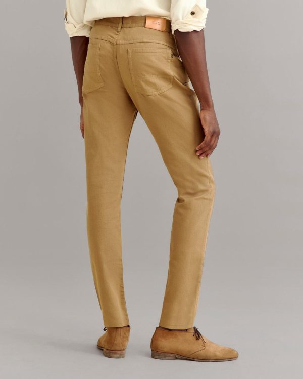 As comfortable as your favorite pair of jeans, these pants are made in a breathable cotton-linen blend with just a hint of stretch for ease of movement and garment-dyed for a lived-in look and feel. Finished with subtle details like an antique brass tack button embossed with our heirloom ribbon stripe and our signature MSL leather patch.