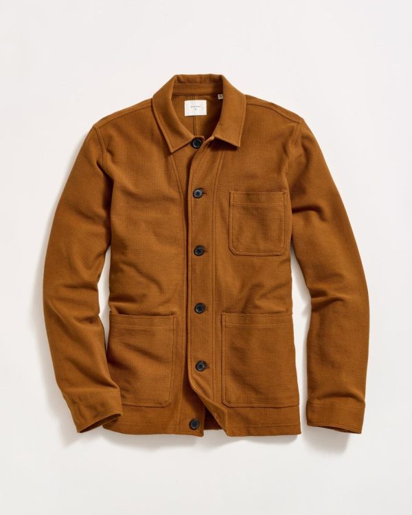 We’re giving the classic chore coat a luxe upgrade, changing out the traditional cotton-canvas for a luxe-feeling, lightweight cotton knit. The result is a piece that feels soft on the skin, flexible to wear over a tee or button-down, and with the pockets and collar of the classic style. It has the same great look of a chore coat, with the feel and warmth of your favorite cardigan. It’s finished with horn buttons down the center placket and our classic heritage ribbon clamshell at the back.
