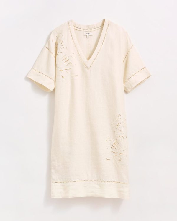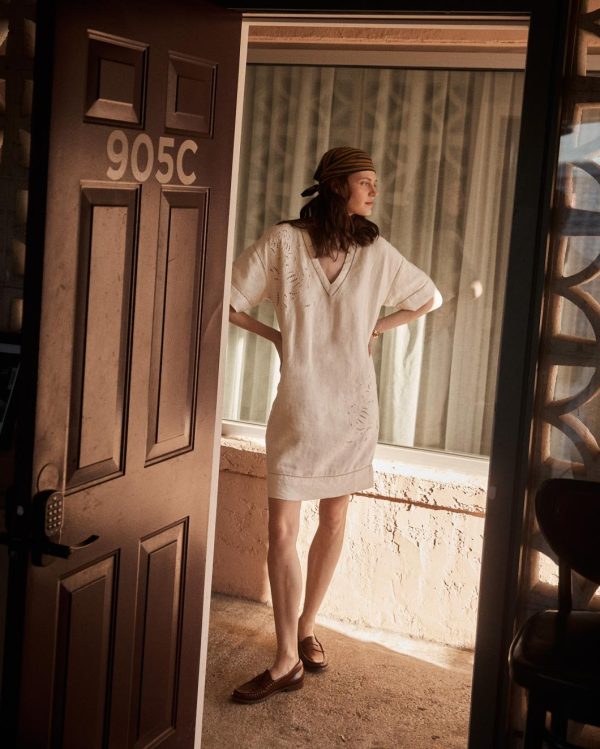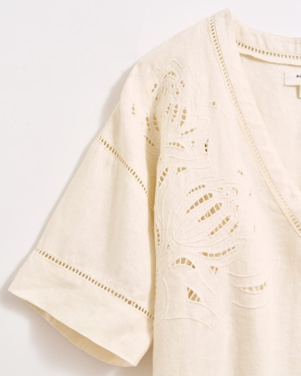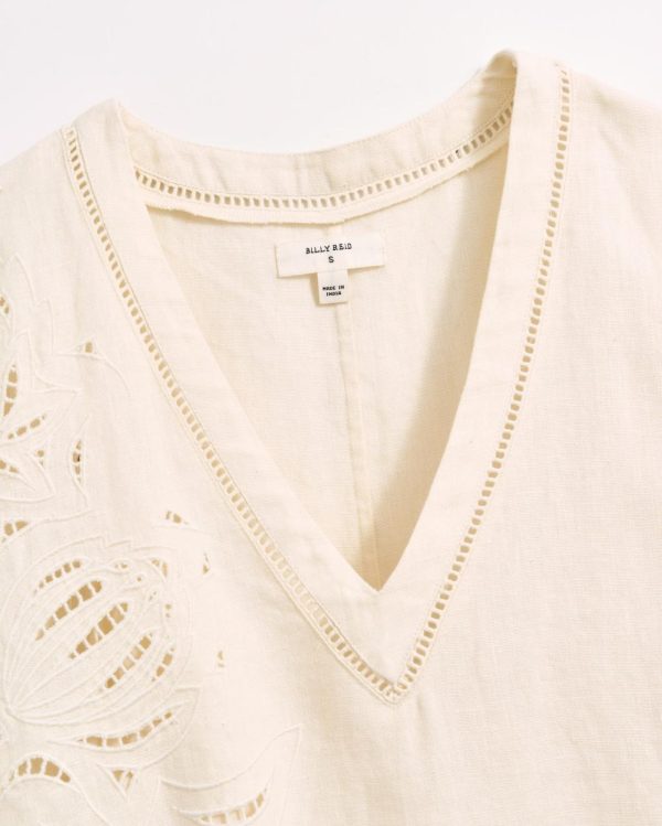 This simple dress will quickly become one of your spring style staples. The 100% linen fabric has a lovely pointelle design embroidered into it at the sleeves and at the hem of the neck. A protea flower motif at the right shoulder and left side complements the look as a modern take on the white eyelet dress. It’s our take on the ubiquitous white summer eyelet dress—built to go anywhere you do.