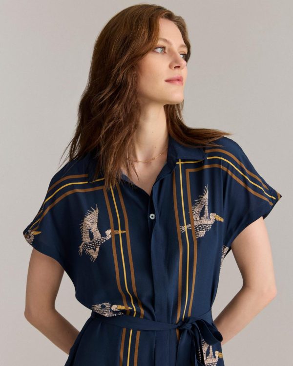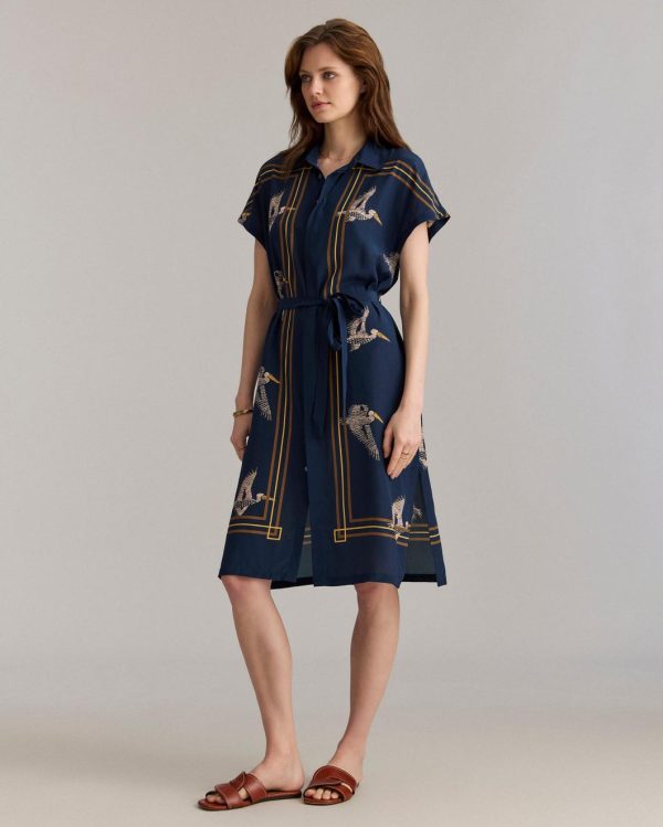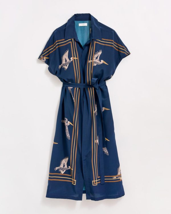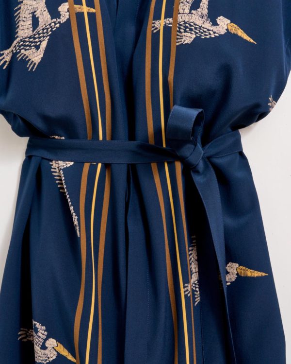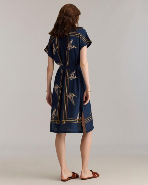 This navy and gold dress is inspired by a piece from our archives. It’s crafted from 100% silk in a relaxed, midi length for easy wear and breathes nicely in the warm weather. The pelican motif is also a heritage symbol for Billy Reid as the state bird of Billy’s first home in Louisiana. This print is custom to Billy Reid and is also featured in the Pelican Lounge Pant.