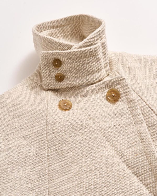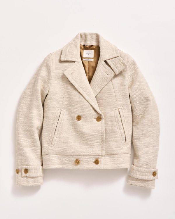 This update on our iconic Bond Peacoat brings all the details of the original with a newly-cropped shape for a more feminine, proportional look. The horizontal slub fabric in cream and white looks great paired with light, airy, spring fashion, without being too heavy for sunny afternoons. The jacket has the classic button front with the classic men’s closure.