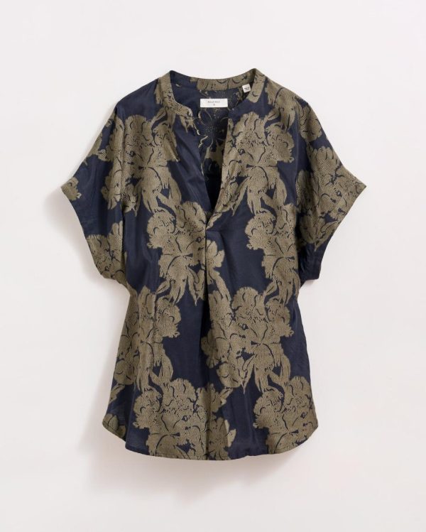 This new style for the season is inspired by—and uses the same fabric as—the Juniper Jacquard Kaftan. The new cut of the blouse is a perfect way to continue the style with a more versatile top that can be easily dressed up or down.
